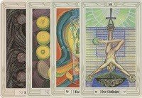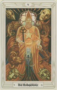 so komplexer Symbolik, dass es unzählige Seiten bräuchte, um sie zu erklären. Am Beispiel des Hohepriesters lässt sich jedoch gut die mystische Tiefe der Tarotkarten erkennen. Der Hohepriester symbolisiert im Tarot normalerweise Moralvorstellungen und Sinnfindung. Im Thoth Tarot jedoch repräsentiert er insbesondere den Beginn des neuen Zeitalters und soll vor leeren Glaubenssystemen warnen.