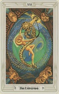 Auf der Tarotkarte „Das Universum“, dass den Kosmos repräsentiert, erscheint im Thoth Tarot die mit einer Schlange tanzende Göttin Eurynome in einem verschlungenen Geflecht, das dem einer Vulva gleicht. Das Auge der Gottheit Shiva ist strahlend auf die Schlange gerichtet. Auch hier zeigt sich die Erneuerung des Universums. Die kunstvoll inszenierten Illustrationen im Crowley Tarot haben sehr oft einen Bezug zu den Bildern der Bibel, insbesondere zur Erbsünde.