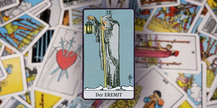 Taucht im Tarot der Eremit auf, zeigt er uns, dass alles, was wir benötigen in unserem Inneren verborgen ist und nicht im Außen. Der Asket richtet sein Augenmerk auf unsere göttliche Natur, um die Schatten wie Enttäuschung und Verletzung zu durchdringen. Ist das Licht in uns sichtbar, bringt es Glückseligkeit, Freude und Liebe.
